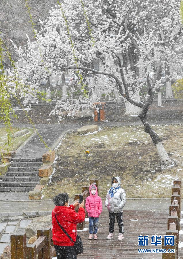 4月21日,在长春市杏花村公园,市民在雪中拍照留念。当日,吉林省多地迎来降雪天气。新华社记者许畅摄