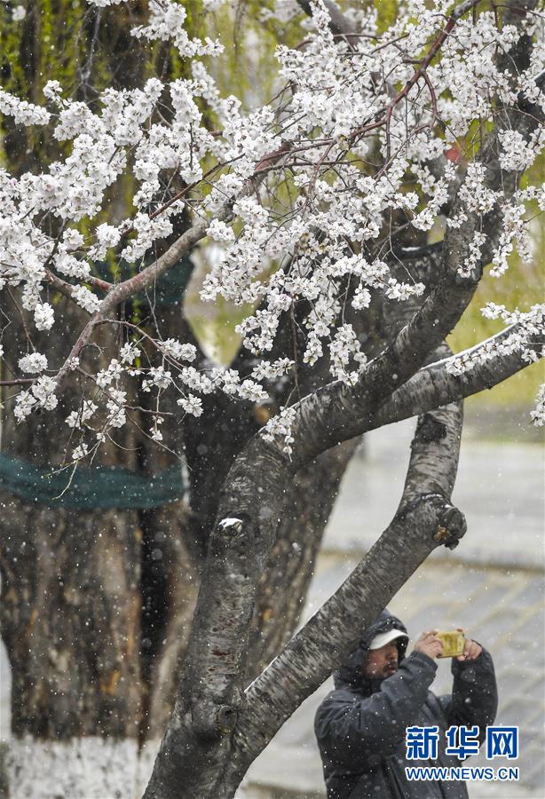 4月21日,市民在长春市杏花村公园拍摄雪景。当日,吉林省多地迎来降雪天气。新华社记者许畅摄