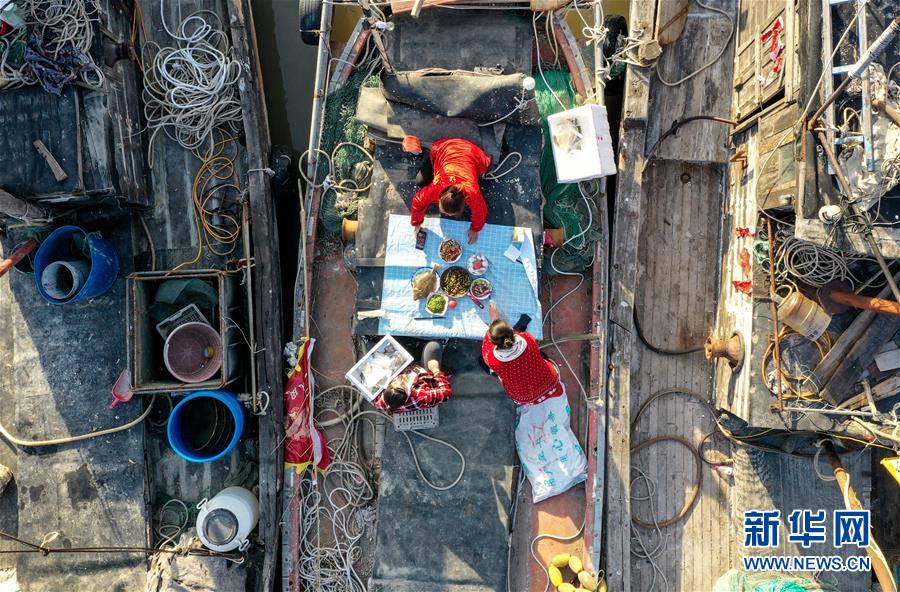 4月22日,马花雨(下右)、徐红红(上)、陆倩(下左)在渔船上拍摄推销海产品的短视频。近年来,江苏省连云港市赣榆区海头镇越来越多的居民开始直播销售海产品,当地渔船、码头和市场上活跃着一批网络直播好手。目前,全镇有3000多户商家从事海产品直播销售业务,形成了集捕捞、加工、包装、销售和物流于一体的电商产业链。新华社记者杨磊摄