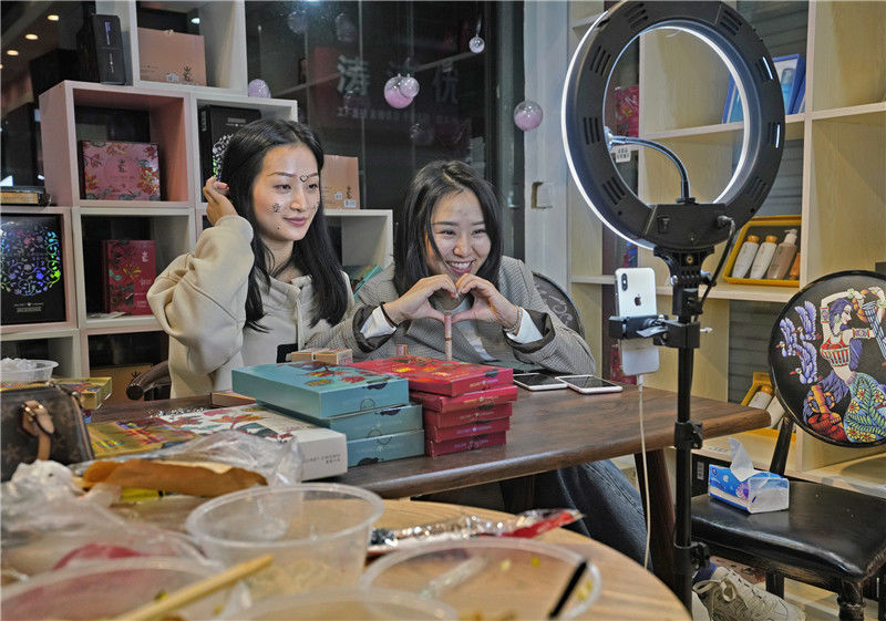 2019年11月10日,浙江金华,义乌北下朱村,俩主播在销售化妆品,一个主播做出爱心的手型,对她们的“老铁”(粉丝)示好。