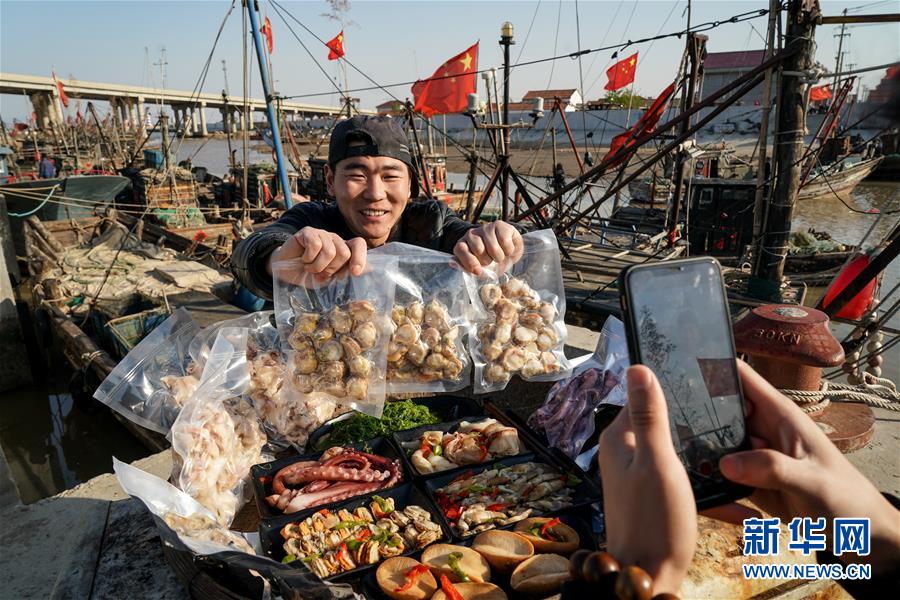 4月22日,31岁的顾峻豪(左)在朱蓬口渔港拍摄短视频推销海产品。他从去年9月起开始做网络主播销售海产品,目前已有12万粉丝。新华社记者杨磊摄