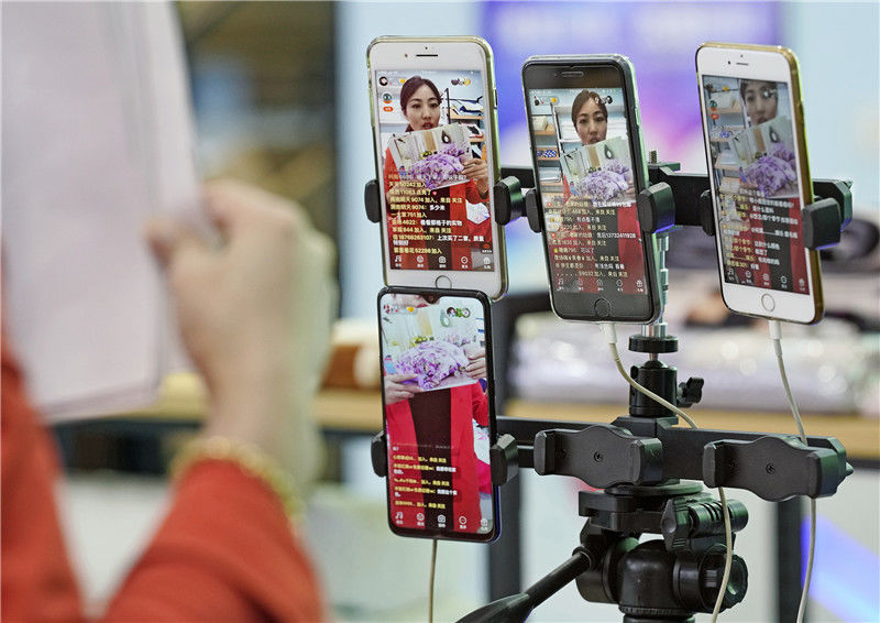 2019年11月11日,浙江金华,义乌北下朱村,一名男子在直播。一名女子在购物。
