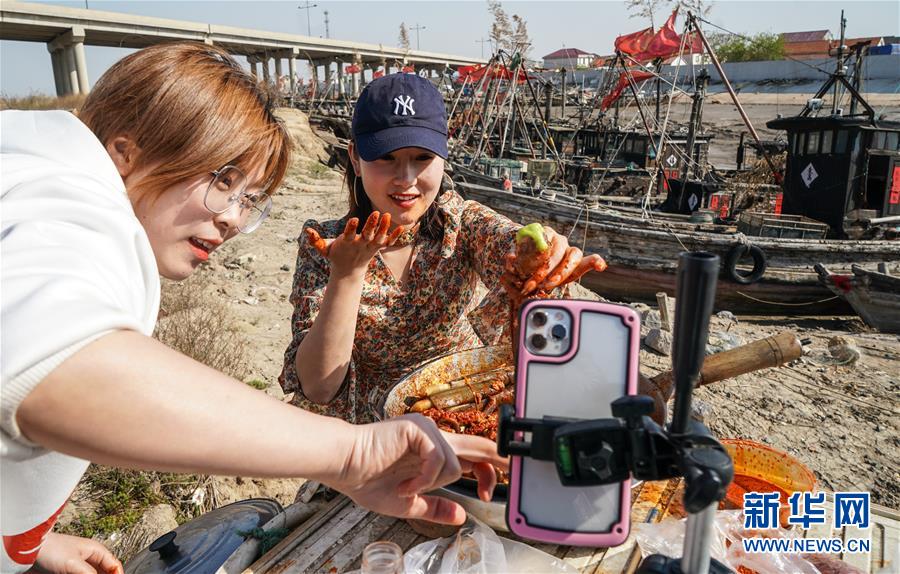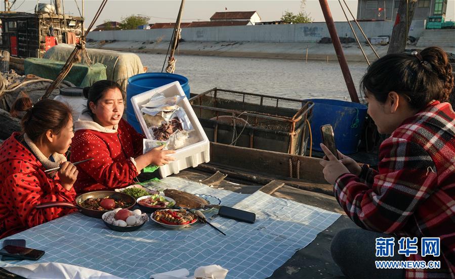 4月22日,马花雨(下右)、徐红红(上)、陆倩(下左)在渔船上拍摄推销海产品的短视频。近年来,江苏省连云港市赣榆区海头镇越来越多的居民开始直播销售海产品,当地渔船、码头和市场上活跃着一批网络直播好手。目前,全镇有3000多户商家从事海产品直播销售业务,形成了集捕捞、加工、包装、销售和物流于一体的电商产业链。新华社记者杨磊摄