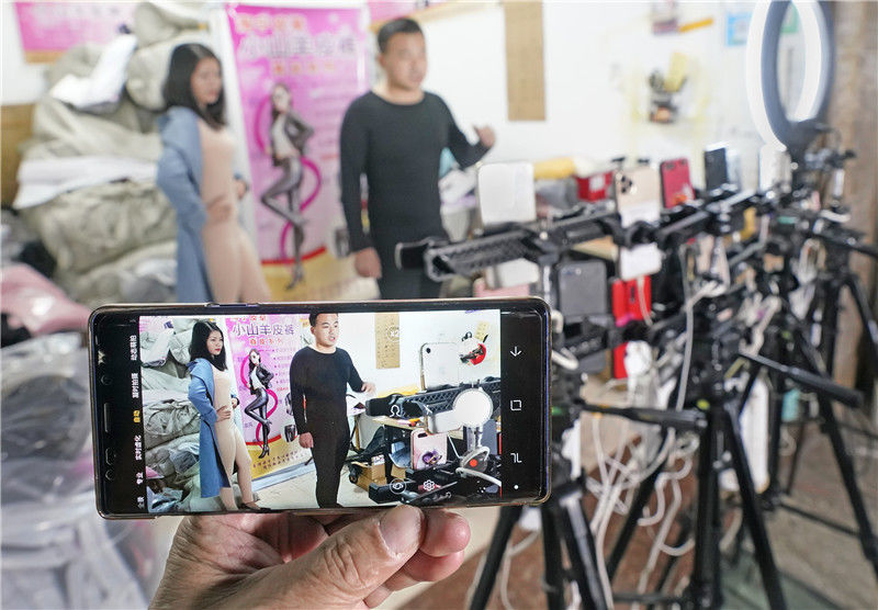 2019年11月9日,浙江金华,义乌北下朱村,俩主播在直播销售保暖内衣。