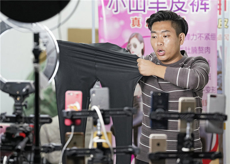 2019年11月10日,浙江金华,义乌北下朱村,男主播在直播销售皮裤。