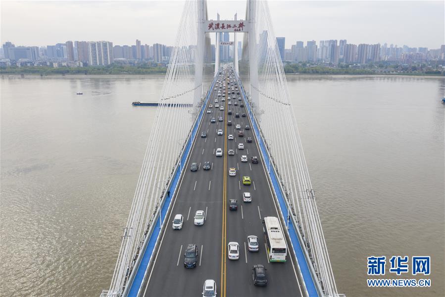 4月14日,武汉长江二桥上车流如织(无人机照片)。新华社记者才扬摄