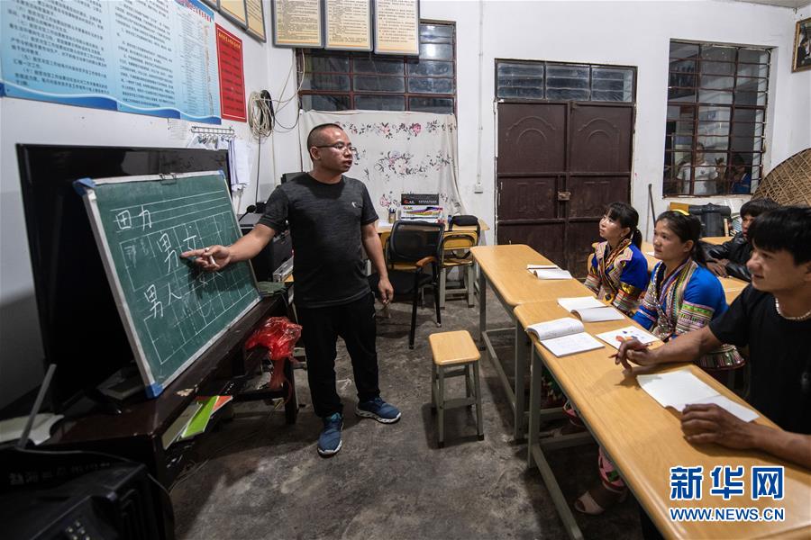 4月10日,在云南省勐海县布朗山乡曼囡村曼班三队,娜四(左二)在村里上夜校。新华社记者胡超摄