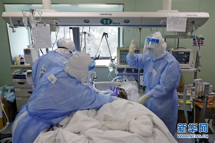 4月24日,在位于武汉的华中科技大学同济医学院附属协和医院西院,医务人员马梦琳、李菠、何珏(从左至右)在护理核酸检测结果转阴的新冠肺炎病人。新华社记者沈伯韩摄