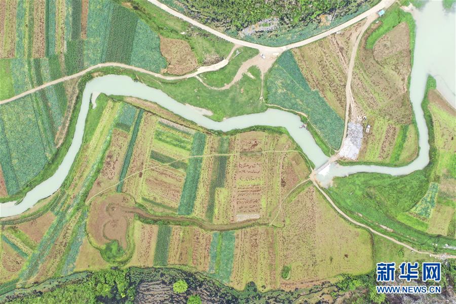 4月23日,在广西隆安县南圩镇,农人赶着牲畜走过一座小桥(无人机照片)。新华社记者周华摄
