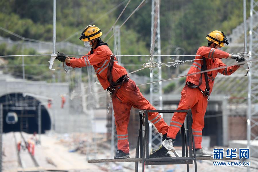 4月25日,在福建省宁德市屏南车站,施工人员开展接触网调整作业。中铁电气化局集团上海公司推动衢宁铁路福建段通信工程、信号工程、电力工程、电气化工程各环节协同复工复产,目前来自河北、河南、四川等国内10个省的900多名员工返岗就业。衢宁铁路北起浙江省衢州市,南至福建省宁德市,全长379.2公里。新华社记者彭张青摄