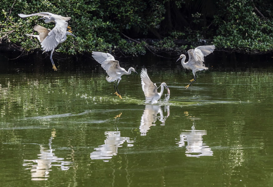 4月15日,摄于南山区华侨城天鹅堡附近。这是深圳拍鹭鸟的其中一个好去处。四只白鹭在水面上争相捕食。徐捷