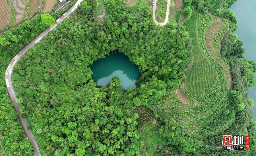 2020年4月24日,在湖南张家界市永定区“百里画廊”茅岩河景区拍摄的“天坑心湖”。(无人机拍摄)当地人称它“天使之泪”。湖的四周峭壁环绕,属于喀斯特地貌。由于地形险峻,这里很少有人踏足,一直保持着原始生态面貌。