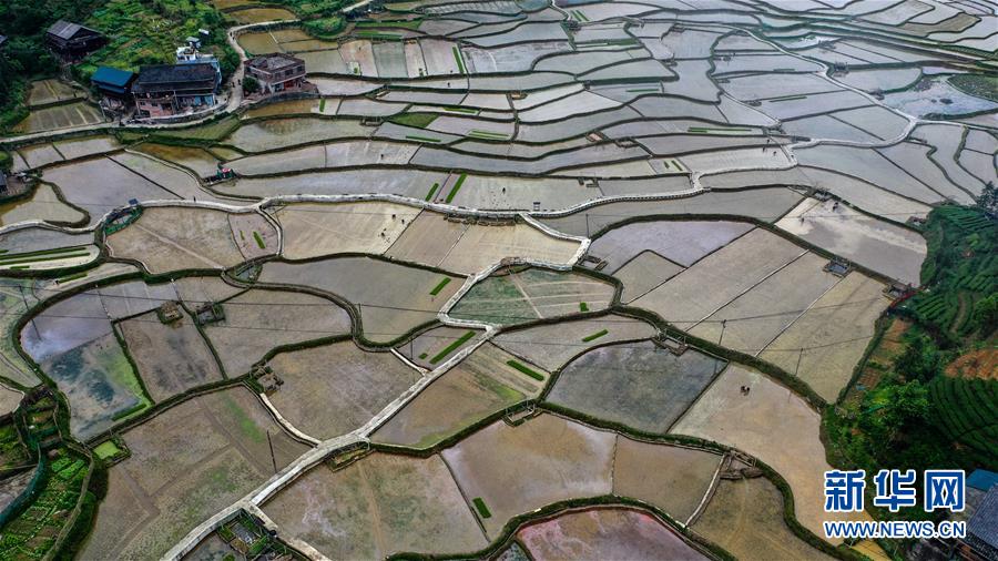广西三江侗族自治县良口乡南寨村村民在田间种植早稻(4月25日无人机照片)。目前,广西柳州市三江侗族自治县群众抓住时令,抢种早稻,培育灵芝和果蔬等经济作物,全力发展生产,决战脱贫攻坚。三江侗族自治县地处滇黔桂石漠化片区,是国家扶贫开发工作重点县。新华社记者张爱林摄