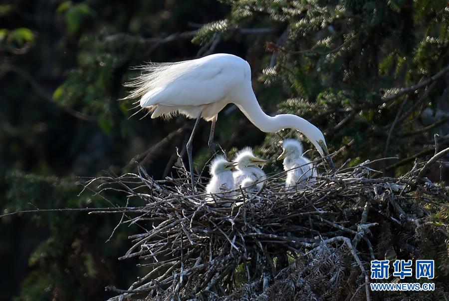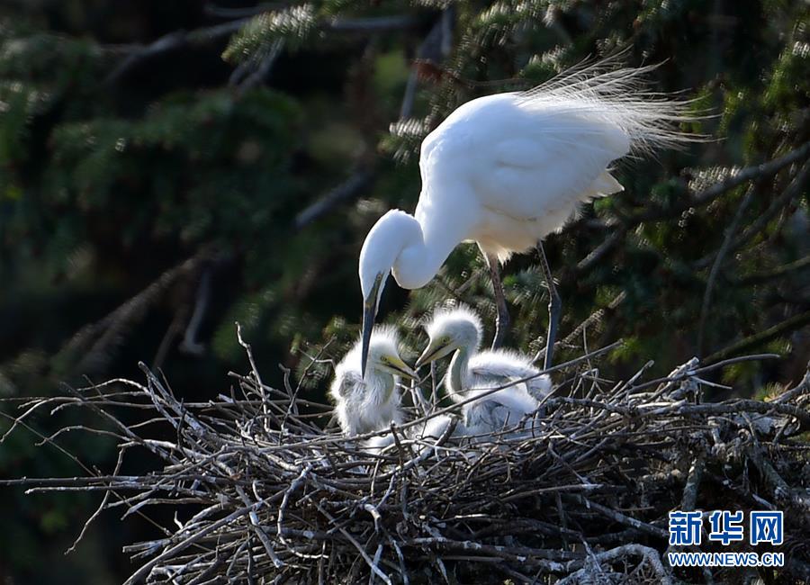 在象山森林公园,白鹭和幼鸟在一起(4月26日摄)。近日,在江西省南昌市新建区象山森林公园内,已安家筑巢的大批鹭鸟正陆续孵化后代,一派生机勃勃的景象。新华社记者彭昭之摄