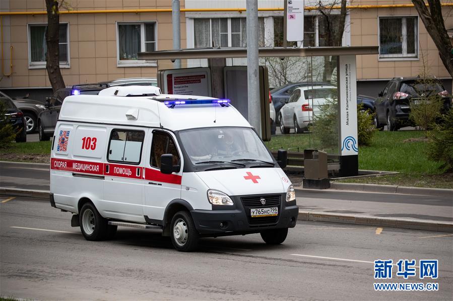 4月27日,在俄罗斯首都莫斯科,救护车从一个住宅区驶离。据俄罗斯防疫指挥部27日消息,过去24小时俄新增新冠肺炎确诊病例6198例,累计确诊87147例,单日增幅7.66%。新华社记者白雪骐摄