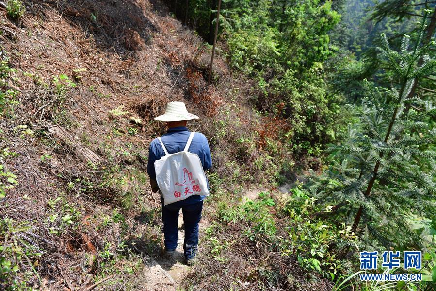 李义成走在山间小路上,准备了解群众春耕生产情况(2019年4月23日摄)。新华社记者黄孝邦摄