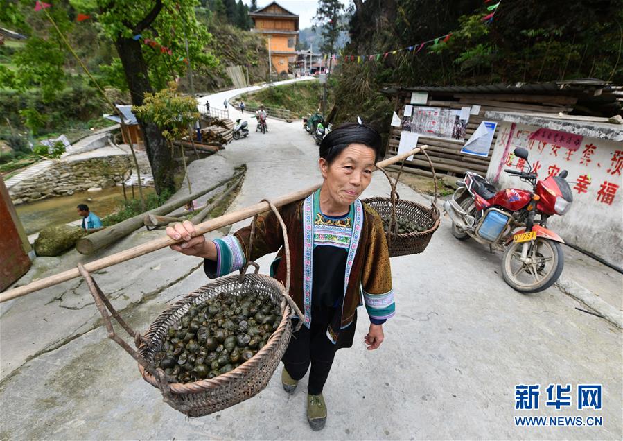 3月25日,在桂黔乌英苗寨,村民将螺苗挑往稻田,准备投放。新华社记者黄孝邦摄