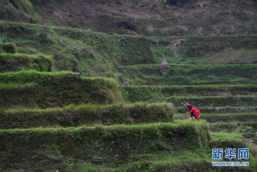 3月25日,在桂黔乌英苗寨,村民往稻田里投放螺苗。新华社记者黄孝邦摄