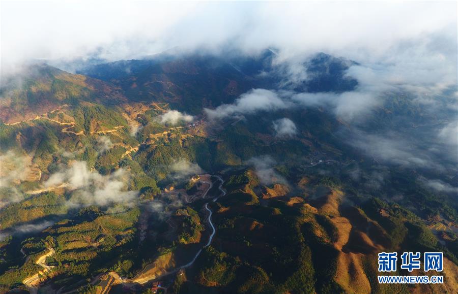 这是云雾缭绕的尧告村(无人机照片,2019年1月18日摄)。新华社记者黄孝邦摄