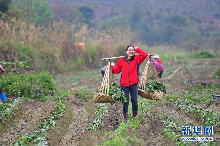 在广西融水苗族自治县永乐镇红薯种植基地,石秋香挑着红薯苗,准备种植(3月14日摄)。