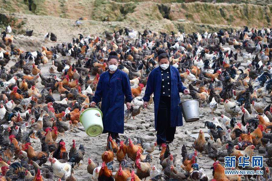 在广西融水苗族自治县香粉乡香粉村,34岁的吴春颖(右)和妹妹吴冬仙在养殖场里喂鸡(3月14日摄)。