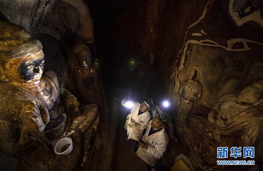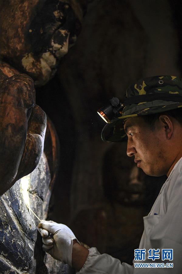 4月27日,文物修复专家在宁夏须弥山石窟圆光寺48号窟内开展修复工作。新华社记者冯开华摄