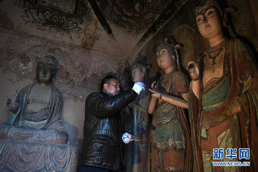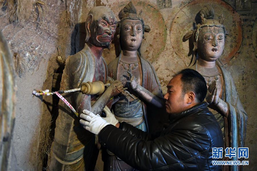 12月25日,在麦积山石窟第11窟,修复师牟常有对塑像破损处进行加固处理。