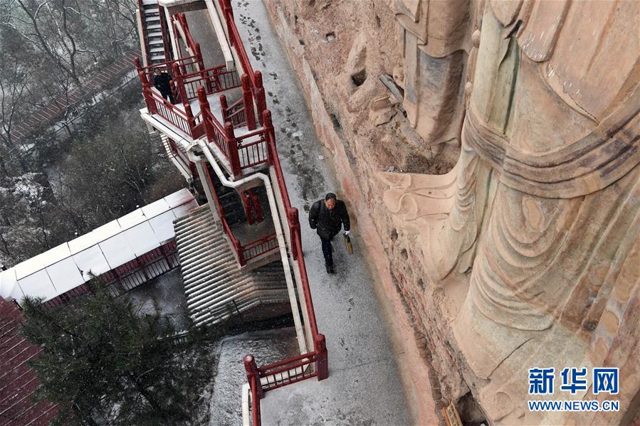 12月26日,游客在麦积山石窟参观游览。一场降雪过后,位于甘肃省天水市的麦积山石窟在晴空下尤为壮美。麦积山石窟是中国四大石窟之一,因其山形似麦垛而得名,现存窟龛221座。新华社记者马宁摄