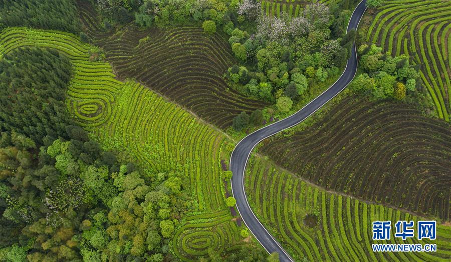 俯瞰鹿鸣茶海一角(4月28日无人机照片)。四川省珙县的鹿鸣茶海,常年云雾缭绕,茶垄依山分布,美不胜收。新华社记者江宏景摄