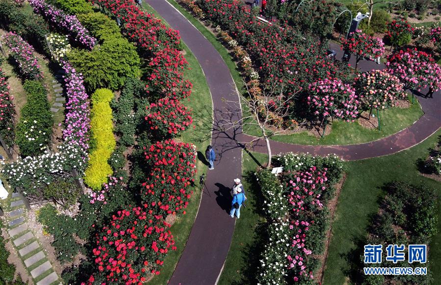 4月28日,游人在上海辰山植物园的月季岛上赏花(无人机照片)。近日,上海迎来月季花期,上海辰山植物园的月季岛上,各色月季竞相绽放,形成绚烂花海。新华社记者刘颖摄