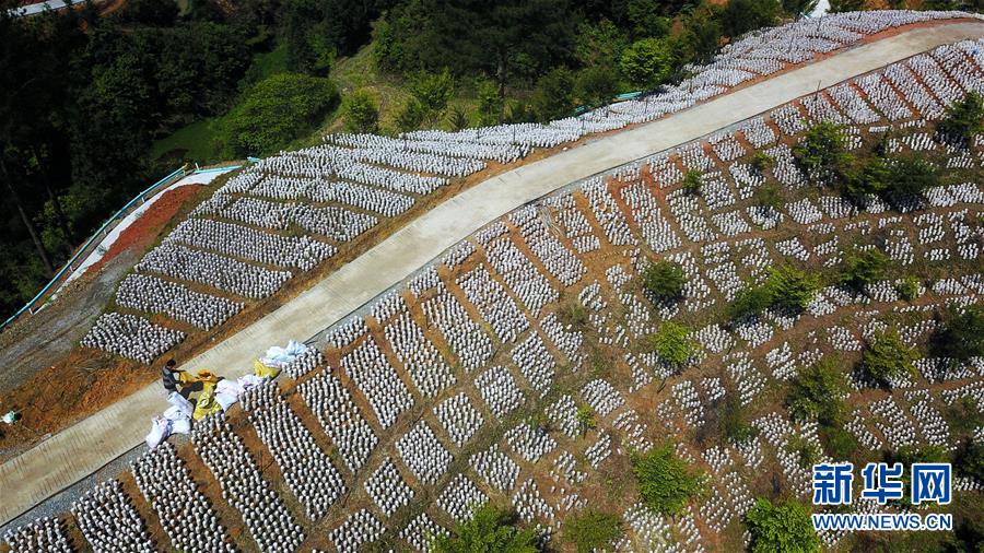 这是4月26日拍摄的剑河县关口万亩生态农业示范基地培育的木耳(无人机照片)。近年来,贵州省黔东南苗族侗族自治州剑河县充分利用林下土地培育木耳,既不耽误林木生长,又发展了食用菌产业。目前,该县采取“龙头企业+合作社+贫困户”的合作模式,大力推广林下木耳种植,带动农民增收。新华社记者杨文斌摄