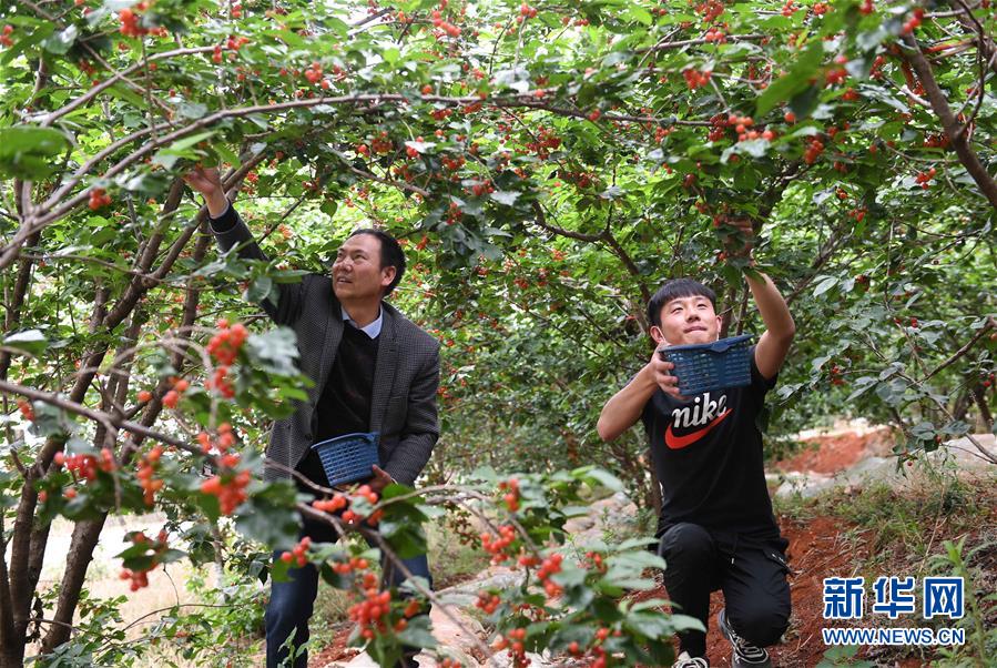 4月28日,两名游客在云南省富民县赤鹫镇普桥村果园摘樱桃。云南省富民县赤鹫镇大力发展特色种植业,全镇种植樱桃4000余亩,帮助当地农民增收致富。新华社记者杨宗友摄