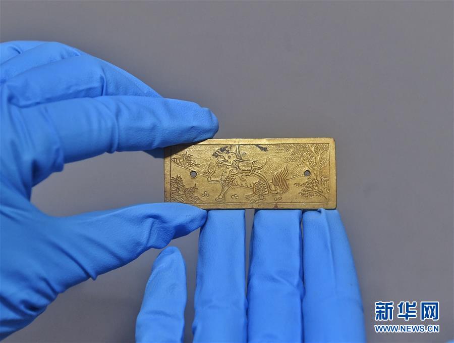 这是发掘出水的麒麟纹金牌饰(4月15日摄)。新华社记者刘坤摄