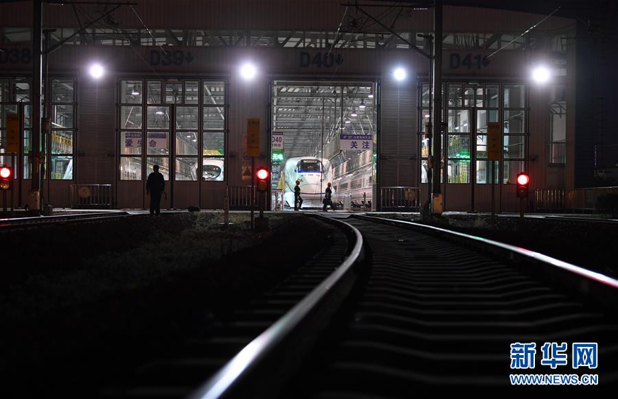 4月29日夜,工作人员行走在合肥南动车运用所检修车间内。每当夜深人静的时候,合肥南动车运用所却灯火通明,“动车安全守护者”们坚守岗位,对动车组进行全面细致检修。新华社记者 刘军喜 摄