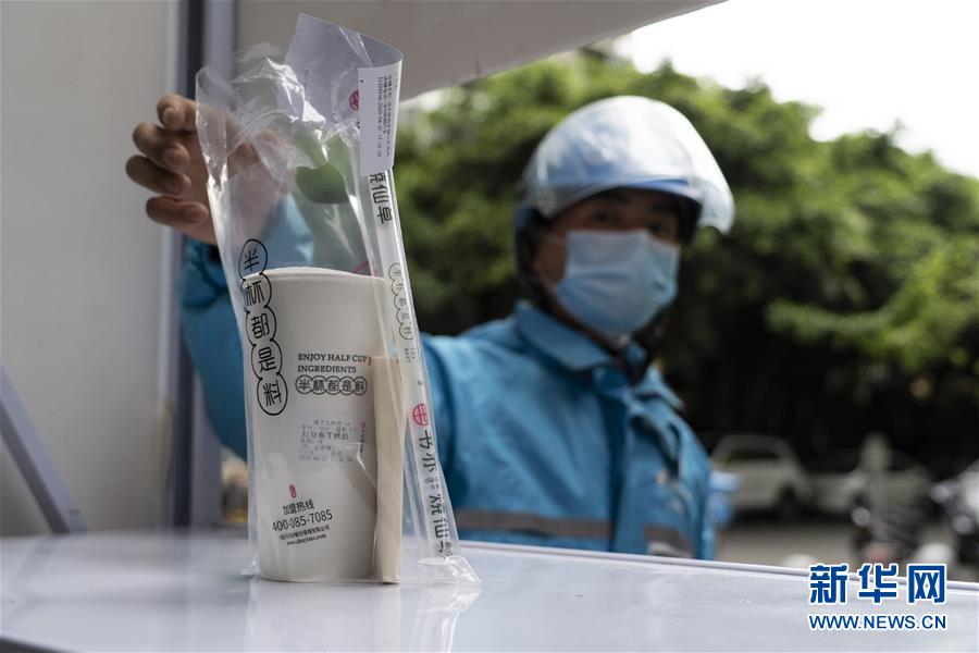 4月22日,在四川省成都市的一家小区无接触配送点,邱有哈子配送奶茶。新华社记者 李梦馨 摄