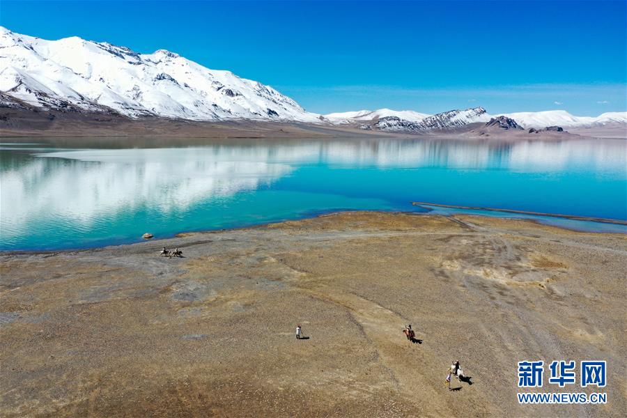 4月30日,牧民在当穹错湖畔骑马(无人机照片)。当穹错地处西藏那曲市尼玛县南部,湖面海拔4475米。暮春时节,湖水碧蓝清亮,让人仿佛置身仙境。新华社记者侯捷摄