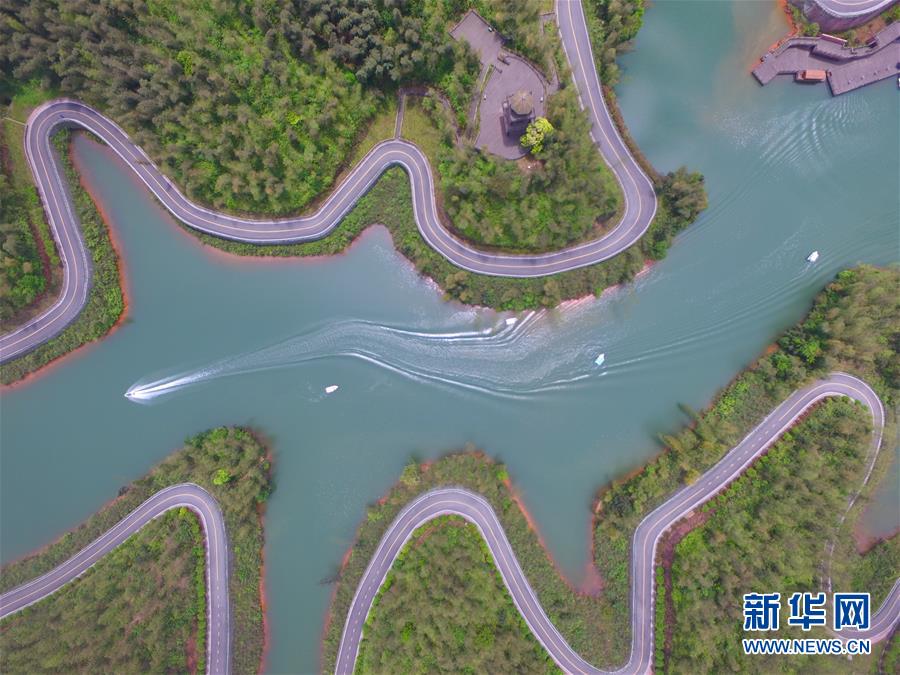 5月1日,在贵州省赤水市竹海国家森林公园里,游客乘坐快艇游览竹海湖(无人机照片)。“五一”假日期间,人们以多种方式放松心情、享受假日。新华社发(张鹏摄)