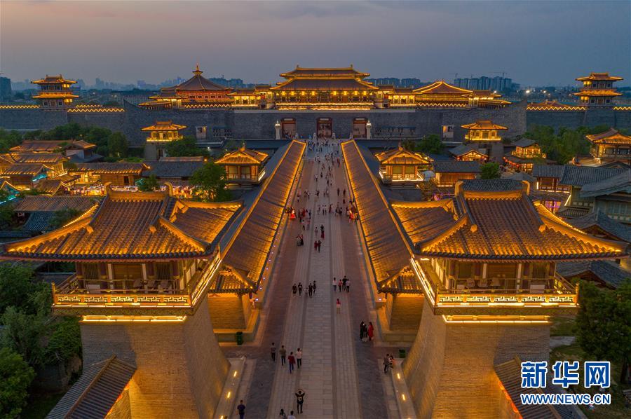 5月1日,游客在湖北省襄阳市唐城景区观赏夜景(无人机照片)。“五一”假日期间,人们以多种方式放松心情、享受假日。新华社发(杨东摄)