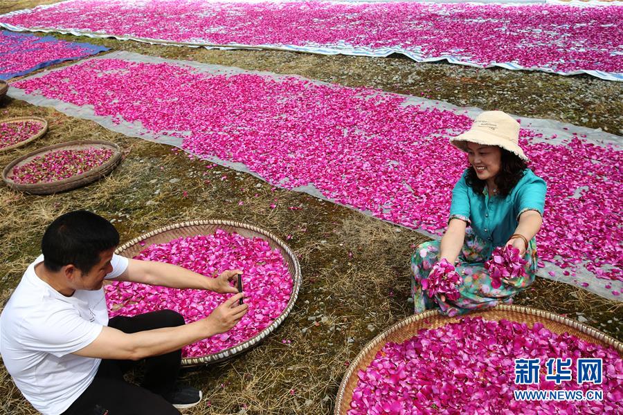 5月1日,游客在重庆市黔江区沙坝镇天香玫瑰庄园体验晾晒玫瑰花瓣。“五一”假日期间,人们以多种方式放松心情、享受假日。新华社发(杨敏摄)