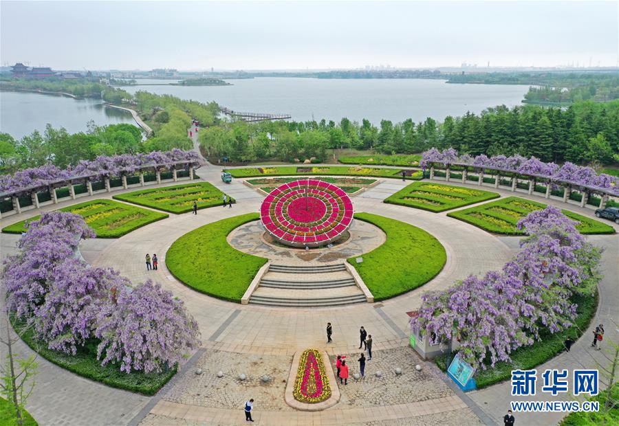 5月2日,游人在位于山东青岛胶州市的青岛大沽河省级生态旅游度假区赏花游玩(无人机照片)。“五一”假日期间,人们以多种方式放松心情、享受假日。新华社发(王昭脉摄)