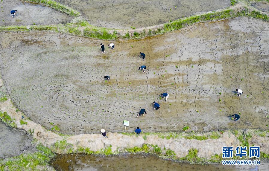 5月1日,游客在江西省新余市渝水区良山镇下保村体验农耕乐趣(无人机拍摄)。“五一”假日期间,人们以多种方式放松心情、享受假日。新华社发(赵春亮摄)
