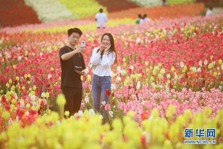 5月1日,游客在四川省遂宁市圣莲花开景区的金鱼草花海中拍照。“五一”假日期间,人们以多种方式放松心情、享受假日。新华社发(刘昌松摄)