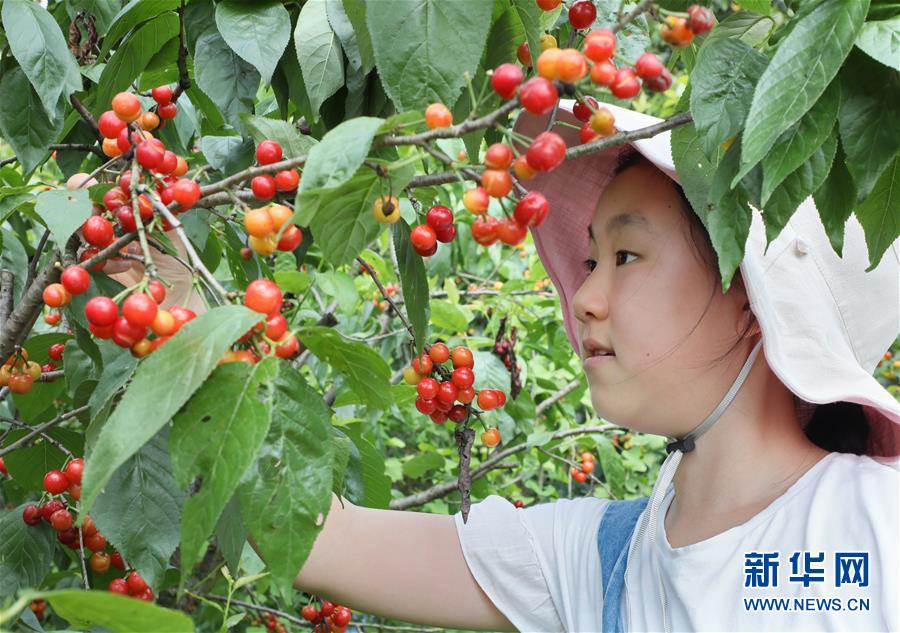 5月2日,一名小游客在江苏无锡宜兴市白塔村樱桃园采摘樱桃。“五一”假日期间,人们以多种方式放松心情、享受假日。新华社发(丁焕新摄)