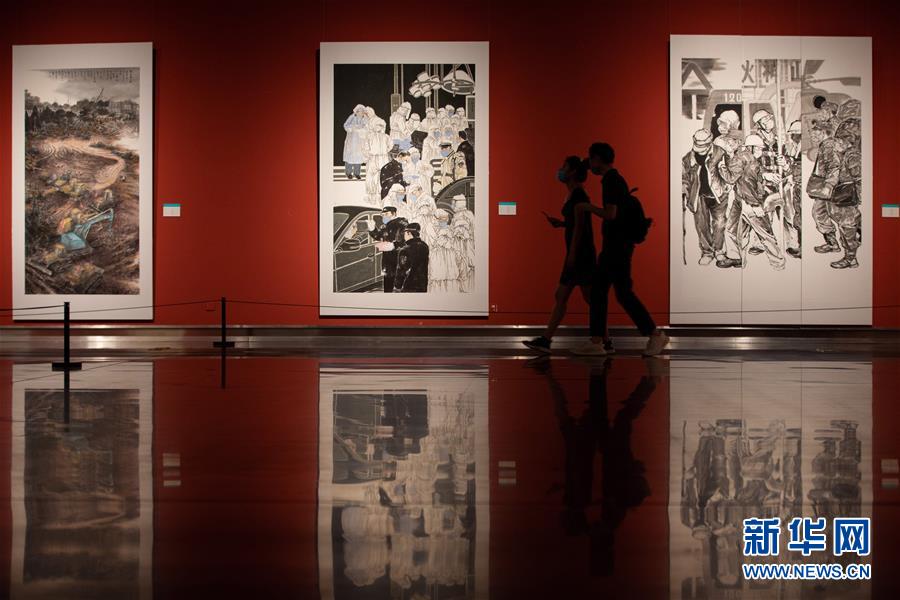 5月2日,观众在位于南京的江苏省美术馆观看江苏省抗疫主题美术书法精品展。“五一”假日期间,人们以多种方式放松心情、享受假日。新华社发(苏阳摄)