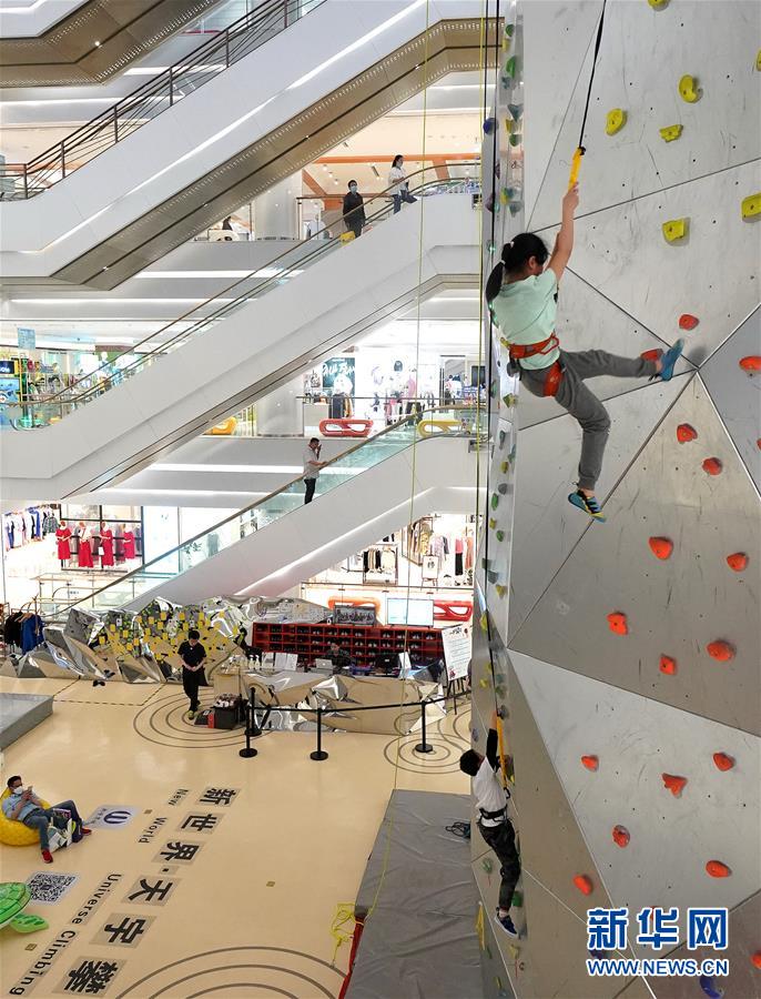 5月2日,小朋友在上海市南京路的一家百货商场内体验攀岩运动。“五一”假日期间,人们以多种方式放松心情、享受假日。新华社记者陈飞摄