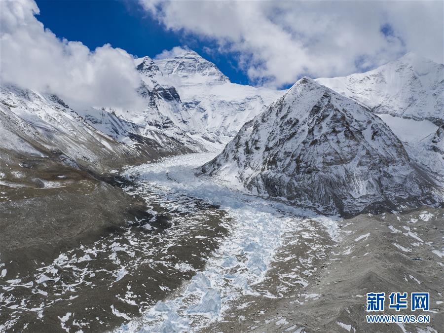 位于珠穆朗玛峰脚下海拔5400米左右的中绒布冰川(4月30日摄,无人机照片)。位于珠穆朗玛峰脚下海拔5400米左右的中绒布冰川,巍峨壮观,冰塔林托起世界最高峰,让人叹为观止。新华社记者普布扎西摄