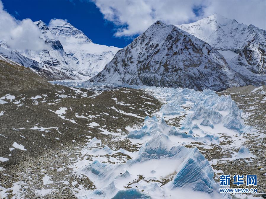 位于珠穆朗玛峰脚下海拔5400米左右的中绒布冰川(4月30日摄,无人机照片)。位于珠穆朗玛峰脚下海拔5400米左右的中绒布冰川,巍峨壮观,冰塔林托起世界最高峰,让人叹为观止。新华社记者晋美多吉摄