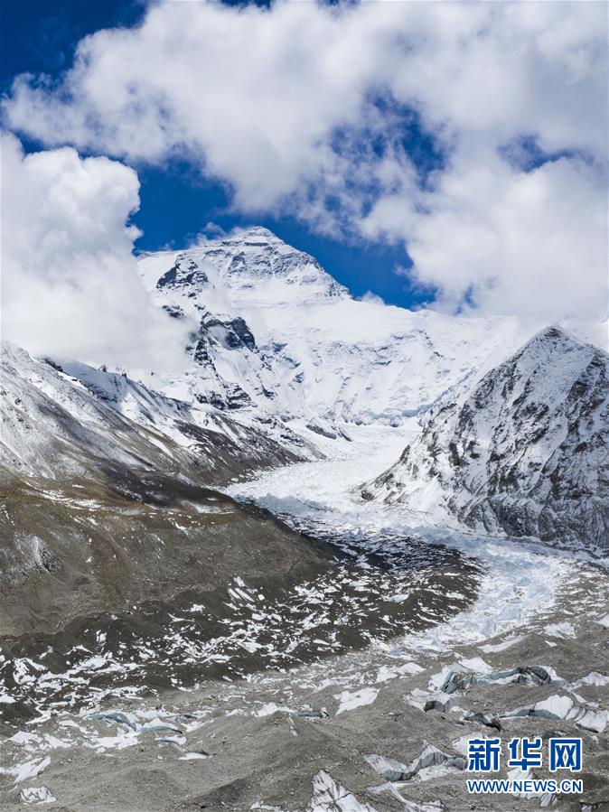 位于珠穆朗玛峰脚下海拔5400米左右的中绒布冰川(4月30日摄,无人机照片)。位于珠穆朗玛峰脚下海拔5400米左右的中绒布冰川,巍峨壮观,冰塔林托起世界最高峰,让人叹为观止。新华社记者旦增尼玛曲珠摄