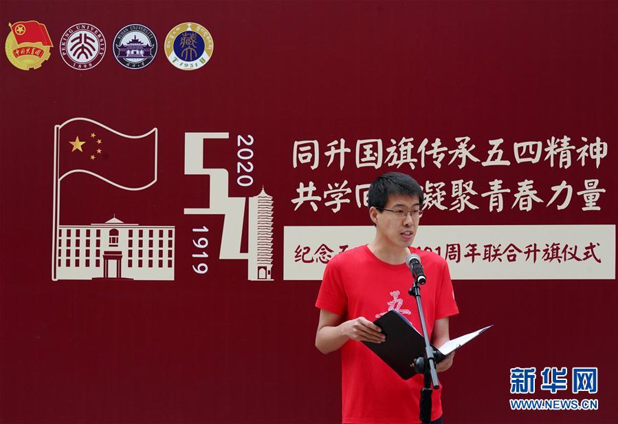 5月4日,北京大学青年代表在升旗仪式上发言。 当日,北京大学通过与武汉大学、西藏大学、北京大学研究生支教团联合举办纪念五四运动升旗仪式以及北京大学2020年五四青春诗会等活动,传承五四精神,纪念五四青年节。 新华社记者 张晨霖 摄