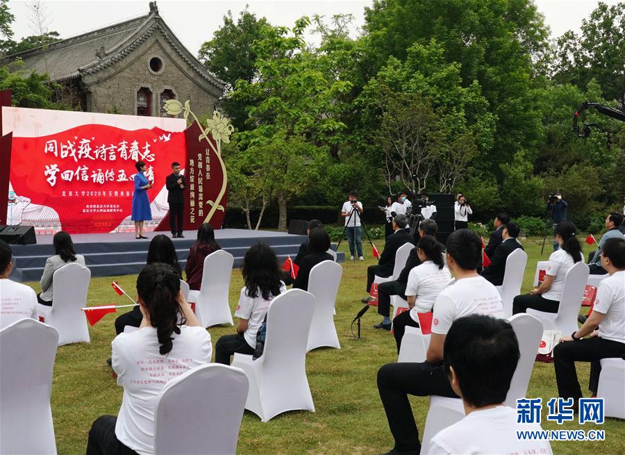 5月4日,北京大学援鄂医疗队代表在北大五四青春诗会上宣誓。 当日,北京大学通过与武汉大学、西藏大学、北京大学研究生支教团联合举办纪念五四运动升旗仪式以及北京大学2020年五四青春诗会等活动,传承五四精神,纪念五四青年节。 新华社记者 张晨霖 摄
